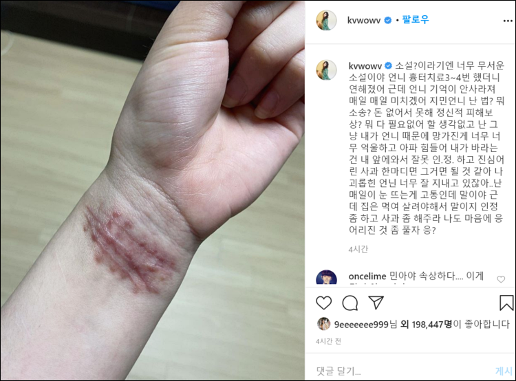 이후 4번째 저격글에서는 흉터가 가득한 자신의 손목 사진과 저격 대상의 실명을 공개하며 사과를 요구하고 있습니다.